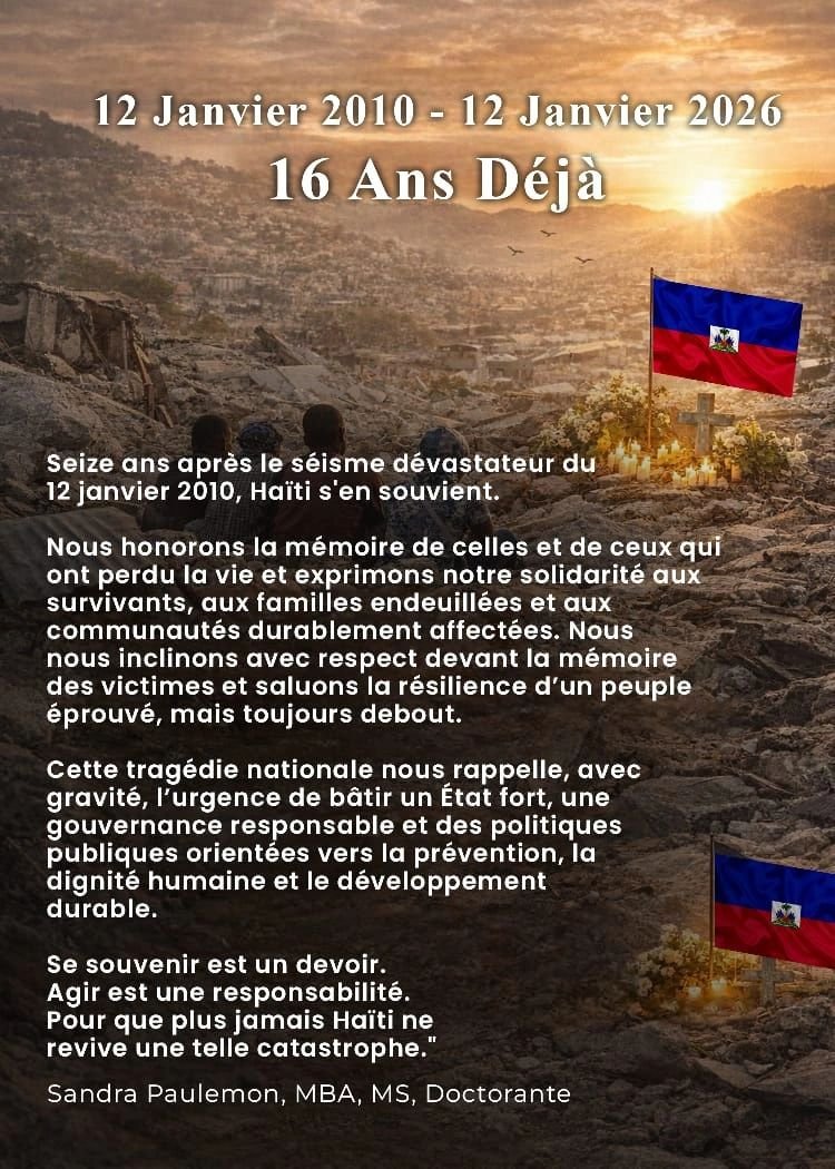 À l’occasion de la commémoration du seizième anniversaire du séisme dévastateur du 12 janvier 2010, plusieurs personnalités publiques ont élevé la voix pour honorer la mémoire des victimes de cette tragédie nationale. Parmi elles, Sandra Paulemon s’est jointe à cet élan de recueillement et de réflexion.